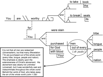 Within the appendix of All Nations Under God, we explore a variety of passages that are usually addressed when the subject of the atonement is addressed. These texts are presented diagrammatically so that the reader can see, graphically, the clear meaning of these passages: Revelation 5:9, John 3:16, Colossians 2:14-15, 2 Peter 3:9, John 6:44, John 1:12-13 and 1 John 2:29, 4:7, 5:1.